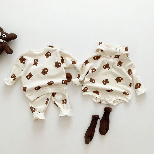 BABY ROMPER AND CARTOON BEAR PRINT JUMPSUIT SET